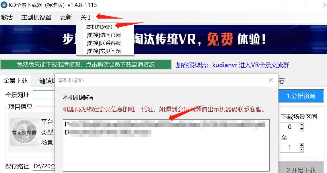由于KD全景下载器的会员信息是绑定激活时电脑的硬件ID,因此如果您更换了电脑整机或电脑配件,则需要提供新电脑的本机机器码和会员激活码找客服免费办理移机,迁移会员信息。本机机器码获取方式:1.4.8版本软件在软件顶部>“关于”里面查看